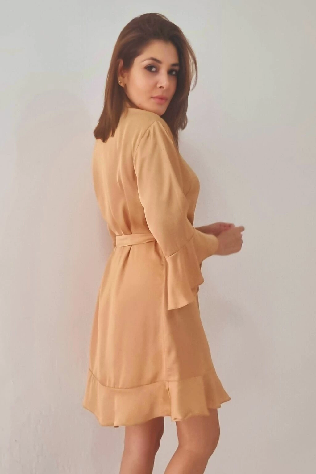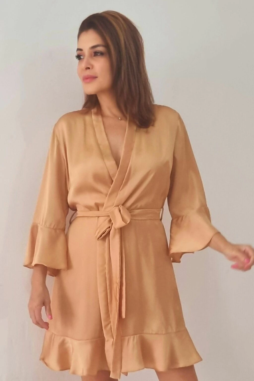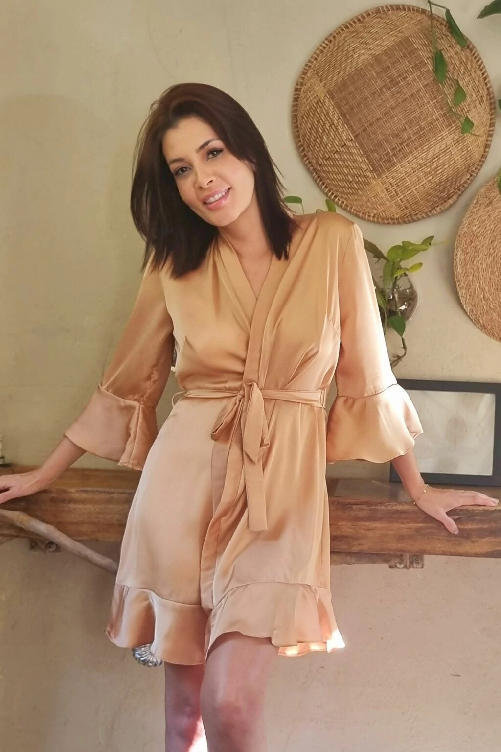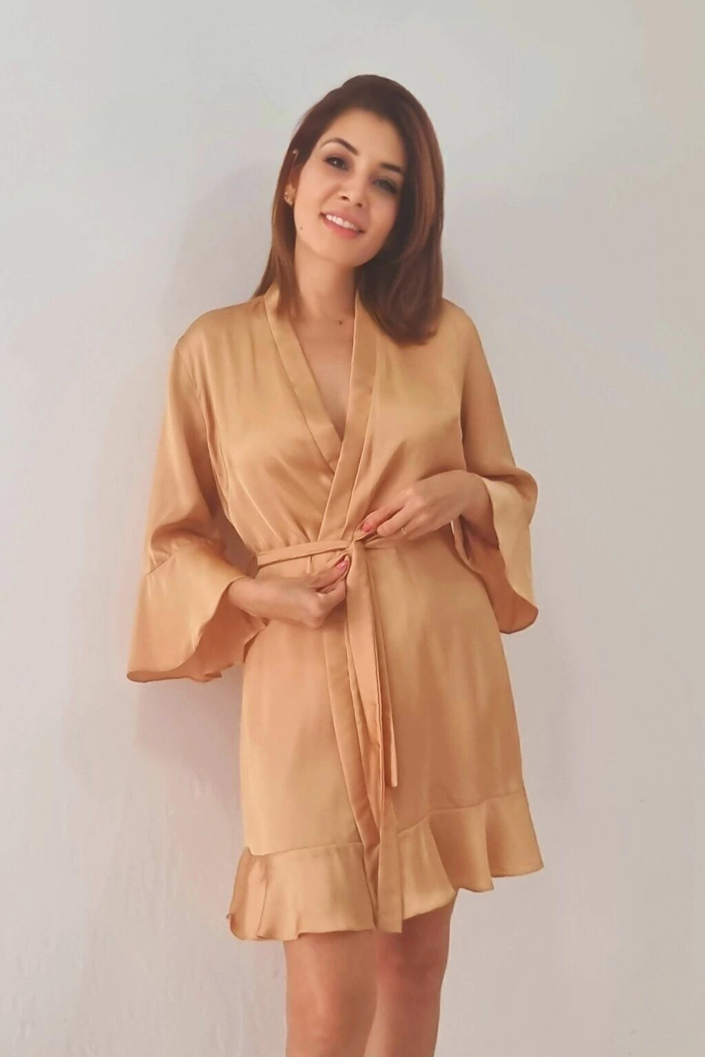 Robe Dayana confeccionado em toque de seda, tecido de alta qualidade, delicado e com bastante caimento no corpo. Possui fechamento por amarração frontal, manga e bainha com babado. É uma peça prática muito apreciada por noivas e madrinhas, mas é perfeito também para ser usado em casa em seus momentos de descanso.
